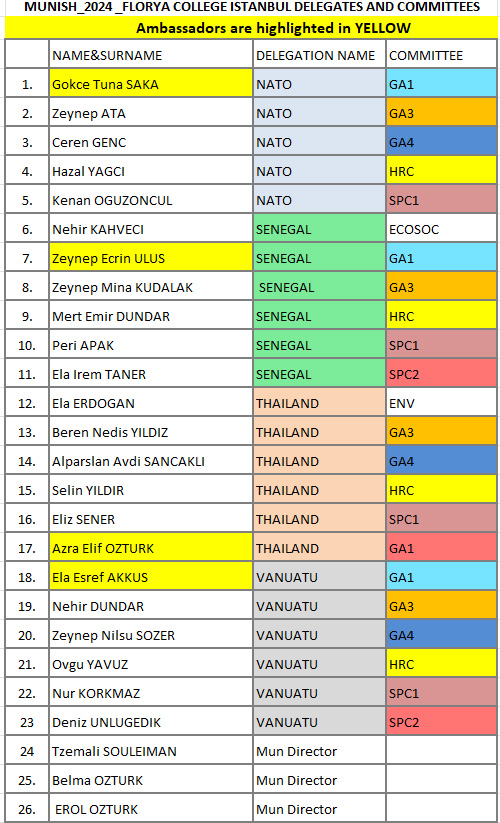 Florya Koleji öğrencileri NATO, Thailand, Senegal ve Vanuatu delegasyonlarını temsil ettiler. 34. MUNISH konferansı için seçilen tema “Çok Taraflılık: Barış ve Güvenliğe Giden Yollar İnşa Etmek”, günümüzün acil küresel sorunlarına yön verirken çok taraflı işbirliğinin önemini ve gerekliliğini vurgulandı. BM Genel Sekreteri António Guterres, bir defasında "yeniden canlandırılmış, kapsayıcı ve ağ bağlantılı çok taraflılığın" önemini ve gerekliliğini yineledi. Böyle bir uygulama, bireysel devlet çıkarlarını aşan kolektif taahhüt ve çabaların, aralıksız çatışma ve istikrarsızlıkla boğuşan mevcut dünyamızda sürdürülebilir barış ve güvenliği sağlamanın anahtarı olduğunu öne sürüyor. Bu temaya uygun olarak, özellikle Güvenlik Konseyi ve Kızıldeniz Sorunu Danışma Paneli ile birlikte bu yılki konferansta önerilen komite ve konseylerin seçilmesi konusunda dikkatli bir değerlendirme yapıldı.